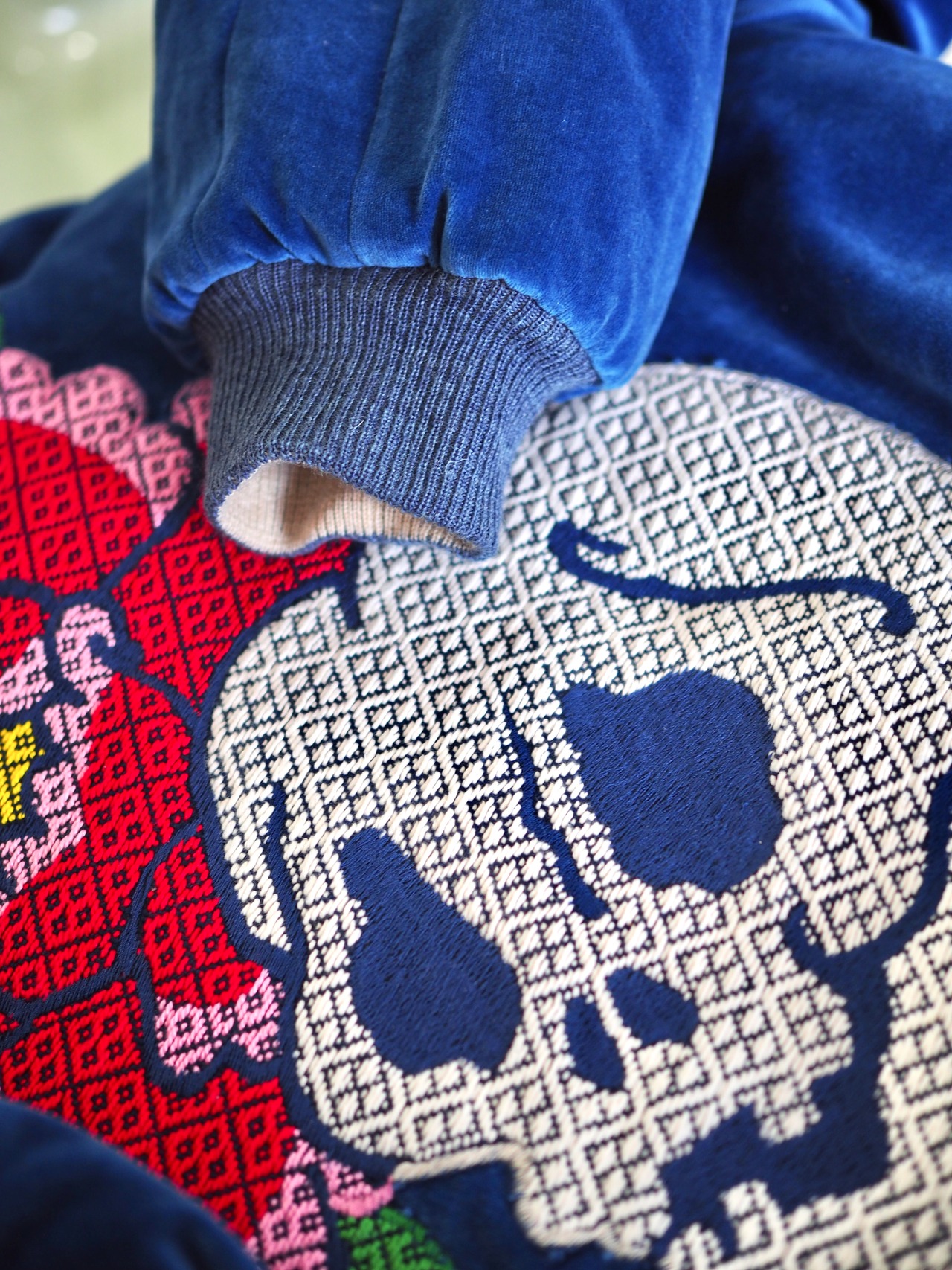 刺繍が特徴であるスカジャンと「モドコ」と呼ばれるこぎん刺しの幾何学的な模様。